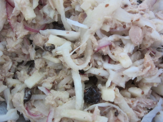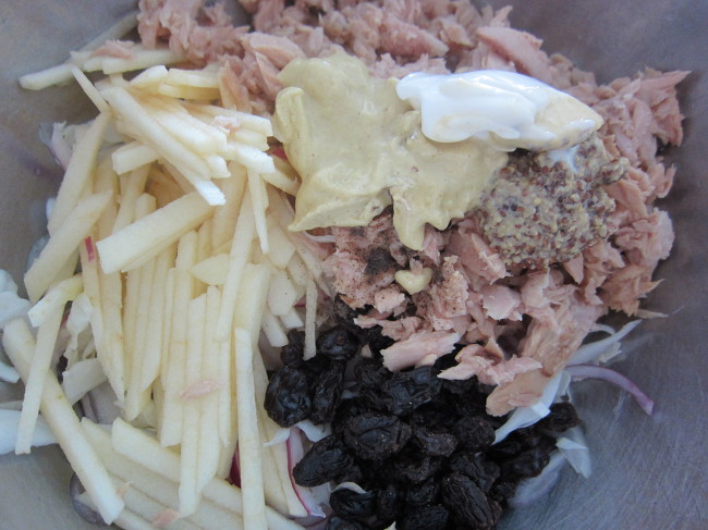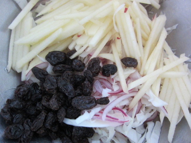 채썬사과와 양배추,건포도를 넣어 버무리고..