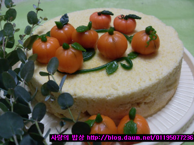 8. 완성된 떡케이크 위에 절편으로 만들은 단호박을 올려 장식한다.