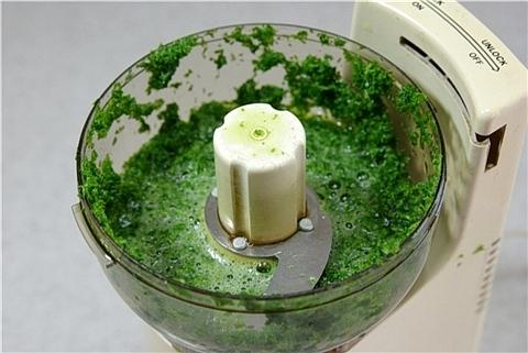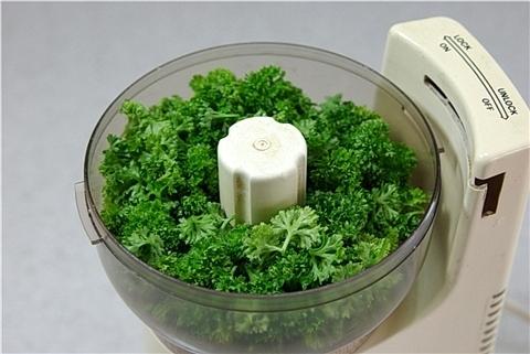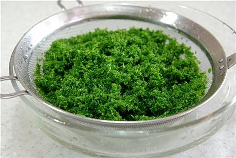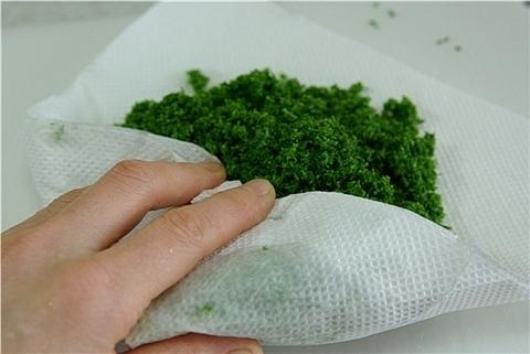 체에서 다진 파슬리 털어내어 키친 타월로 꼭짜서