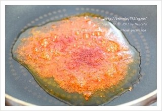 달군팬에 오일을 3큰술 두르고 고춧가루 2큰술을 살살 뿌려준뒤 불을 꺼줍니다..