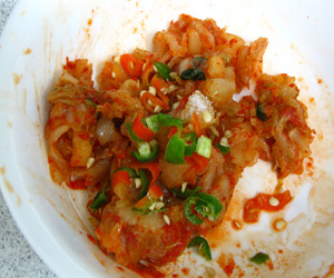 김치는 송송썰어서 물기를 꼬옥~짭니다... 청량고추도 송송썰어넣고, 설탕약간과 참기름을 넣어 조물조물 무쳐놓습니다... (매운맛을 좋아하시는분들은 청량고추의 양을 늘려 주셔두 되구요..)
