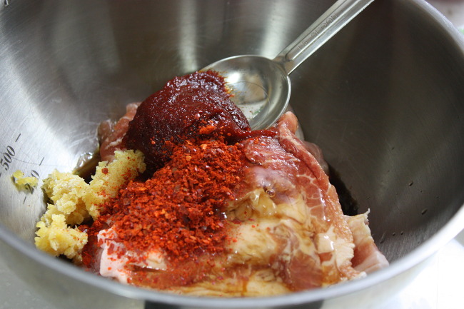 볼에 돼지고기 넣고 분량의 양념넣어 재워 주세요.