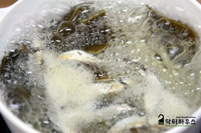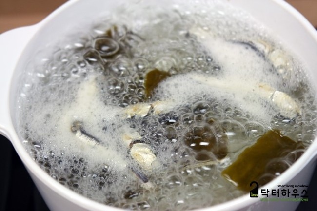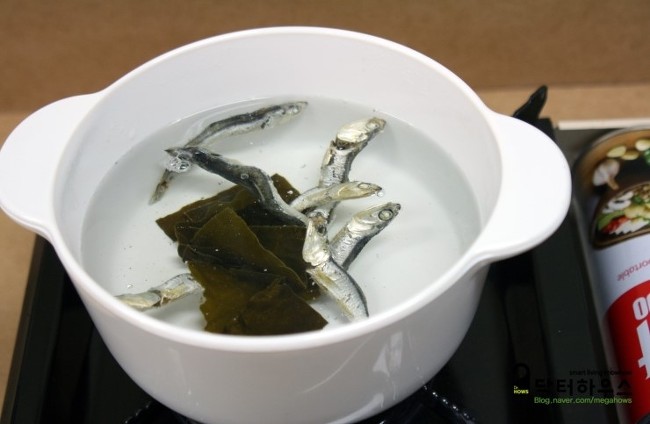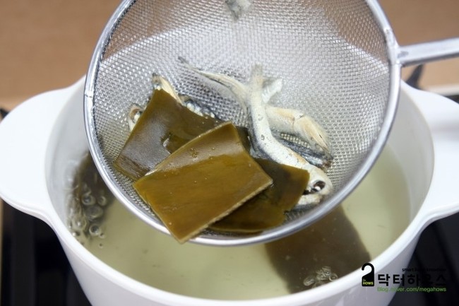 어느 정도 끓으면 멸치와 다시마를 건져내고~