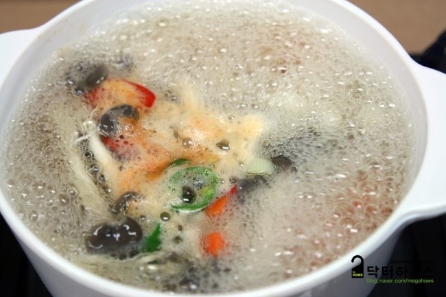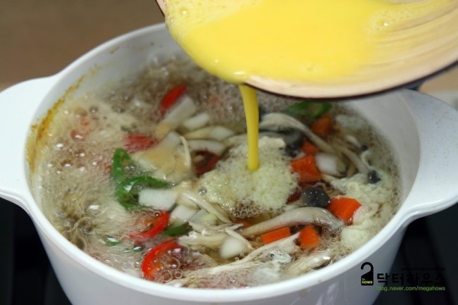 다시 팍팍 끓여서~ 계란을 뺀 나머지 재료를 넣어주고 또 끓여줍니다.