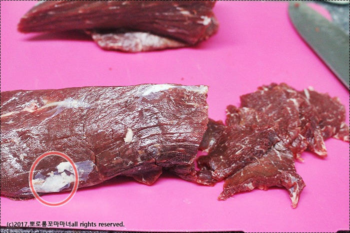 너무 두꺼우면 좀 그럴까봐 결 반대방향으로 되도록이면 얇게 썰어줬어요.