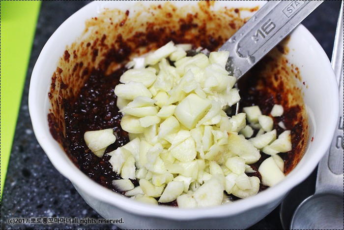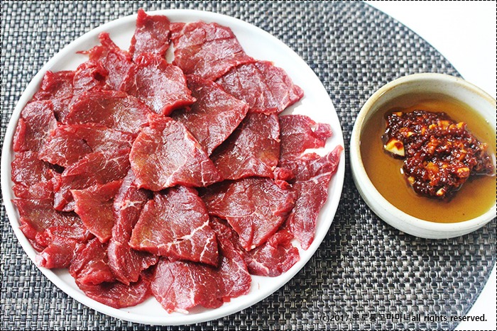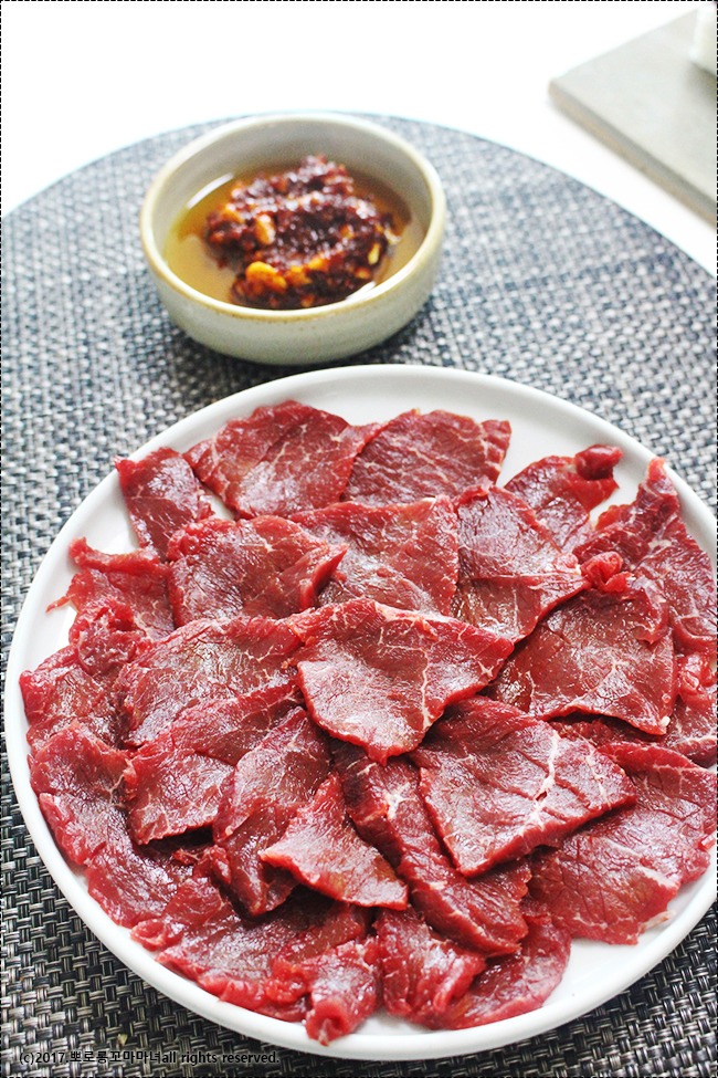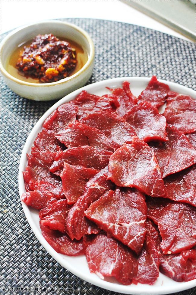 뭉티기 양념 : 고추가루 2큰술, 간장 2큰술, 곱게다진마늘 1큰술, 설탕 1큰술, 작게 다진마늘 한줌