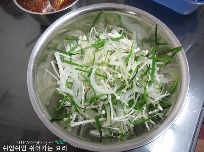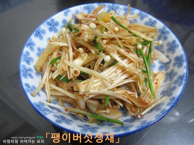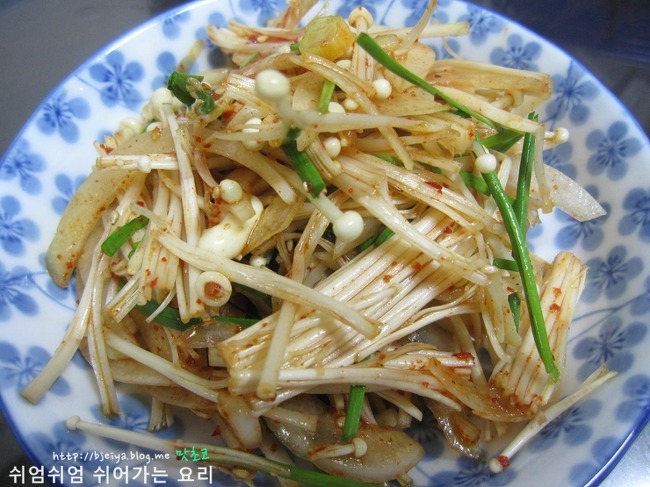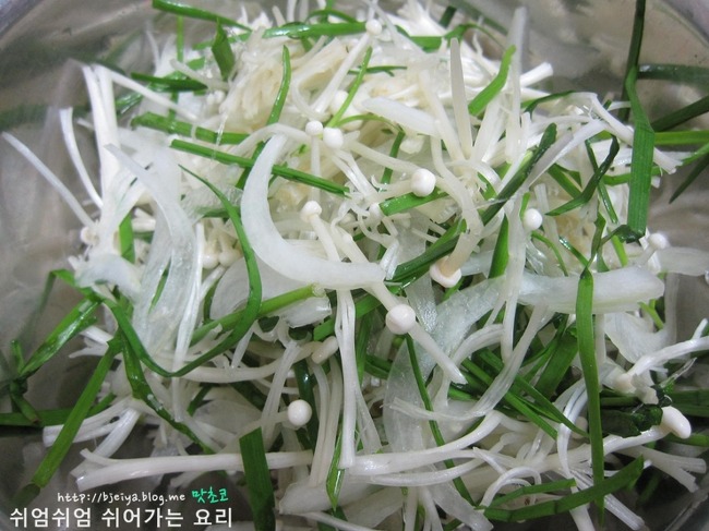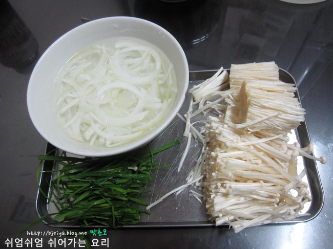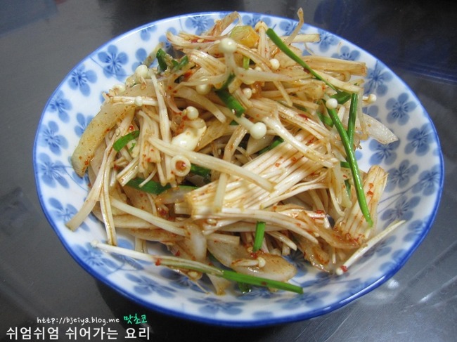 쫄깃쫄깃한 팽이버섯과 아삭한 양파맛이 잘어울린다.