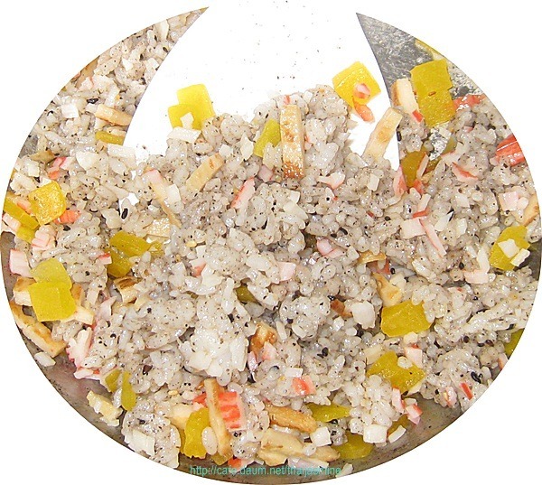 재료: 밥1공기,단무지2개,오뎅2개,맛살1개,김가루,맛소금,참기름,깨소금