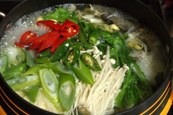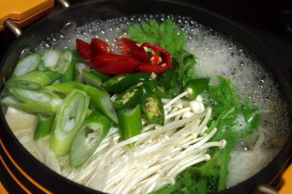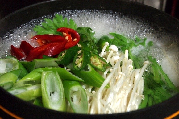 11. 두부가 불어터지면 다 된거니 마무리로 쑥갓.팽이버섯.대파.청.홍고추를 투하합니다.