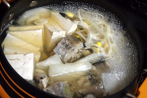 10. 국물맛을 봤을때 콩나물의 비린맛이 없다치면 두부를 숭덩숭덩 썰어 넣어 주세요.