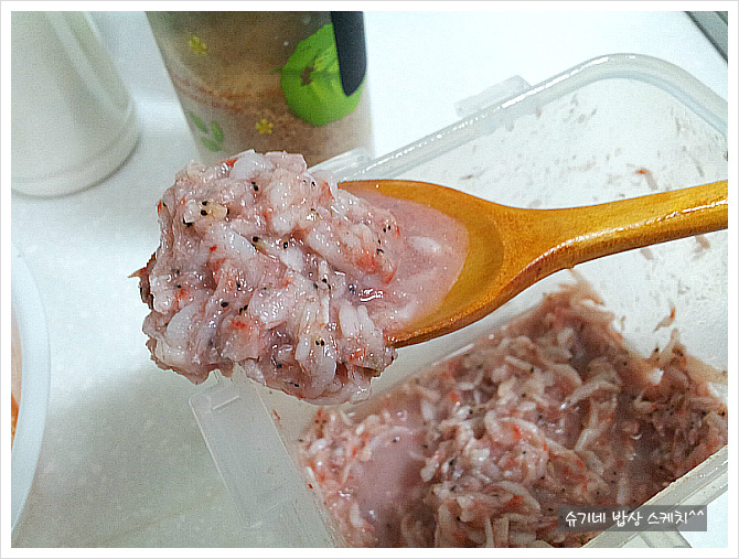 게란노른자, 새우젓 약간, 김가루, 올려서 불끕니다.