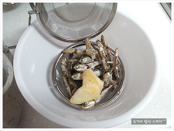 우려논 육수가 없어서 국물용 멸치 한줌하고 편생강 하나 넣어서 같이 끓였습니다.