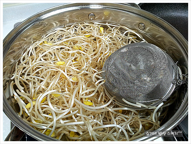 콩나물 한봉을 깨끗히 씻어 물 넉넉히 붓고 멸치망 함께 넣어 센불에 끓여줍니다.