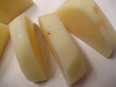 감자를 2등분해 8mm 두께로 좀 두틈하게 썰었습니다.