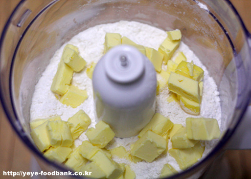 용기안에 박력분과 강력분, 슈가파우더, 차가운 버터를 작게 썰어넣고 돌려