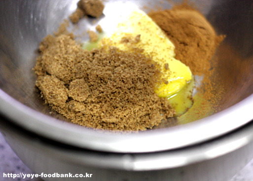 볼에 버터, 흑설탕, 계피가루, 소금을 넣은다음..