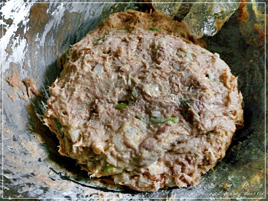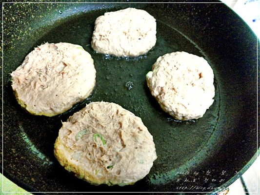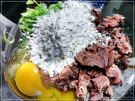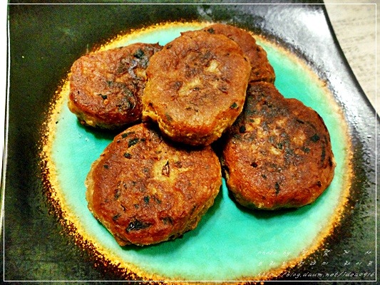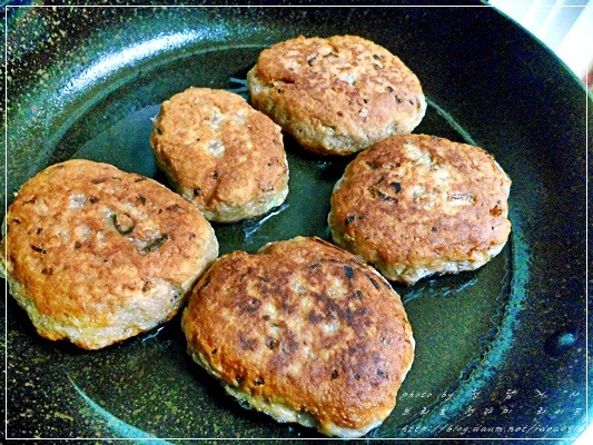 참치캔 큰것으로 두개와 양파 대파는 잘 다져주고 계란1개, 녹말가루를 넣고