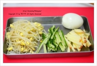 콩나물은 삶고, 오이와 사과는 채썰어주세요..