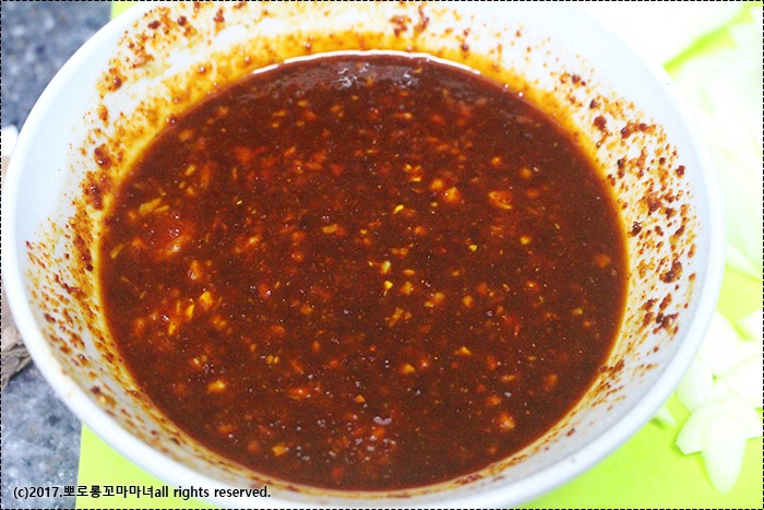 양념장 : 양조간장 3큰술, 고추장 3큰술, 올리고당 3큰술, 매실청 1큰술, 고추가루 3-4큰술, 다진마늘 2큰술, 후추가루, 생강가루, 참기름 약간, 청주 2큰술