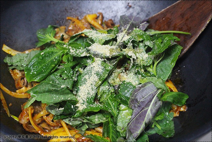 곱창에 양념이 잘 스며들고 익으면~깻순과 들깨가루 넣고 들기름 약간 넣은 뒤에