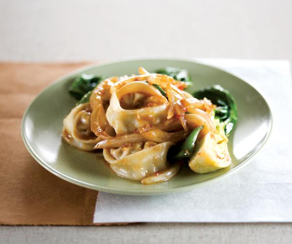 4. 접시에 삶은 만두를 담고 ③의 야채볶음을 듬뿍 얹은 뒤 대파를 송송 썰어 뿌려 낸다.