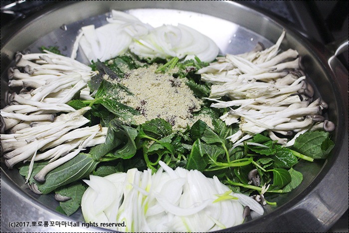 돼지곱창 300g, 양파 반개, 대파 반개, 맛타리버섯 1/3팩, 깻순 적당량, 들깨가루, 멸치다시마육수
