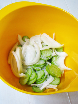 암튼, 썰어논 오이와 분량의 양파를 굵은 소금1/2스푼정도를 넣고...2~3분가량 절인후...