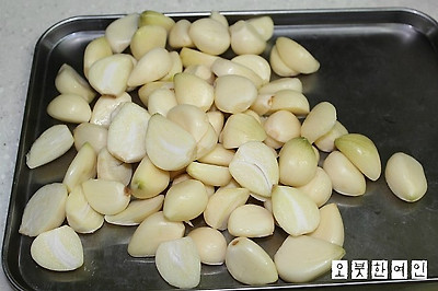 1.마늘은 씻어 물기제거,마늘이 크면 반으로 갈라줍니다.