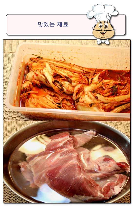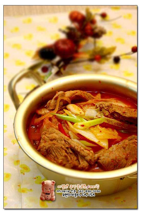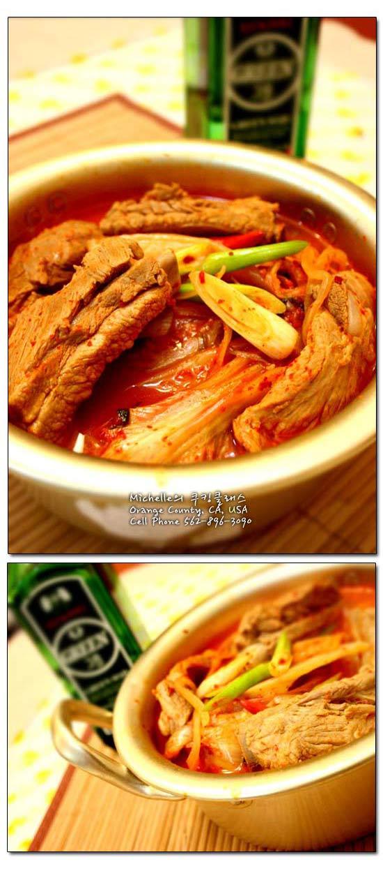 3) 볶아 놓은 김치 위에 양념해 놓은 등갈비를 얹고 만들어 놓은 육수를 충분히 부은 후 끓입니다.