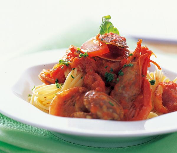 6. ⑤에 ④를 넣어 고루 섞은 후 쫄깃하게 삶아 건진 스파게티를 넣고 고루 버무려 접시에 담는다. 다진 파슬리와 바질로 향을 더한다.