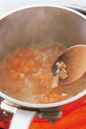 3. 달군 팬에 올리브오일 3큰술을 덜어 두르고 토마토와 양파를 달달 볶는다. 이때 불의 세기는 센 불이 적당.