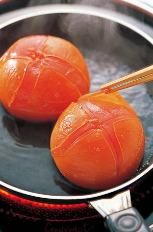 1. 토마토는 꼭지를 자르고 깨끗하게 씻은 다음 위쪽에 열십자로 살짝 칼집을 넣어 팔팔 끓는 물에 살짝 데친다.