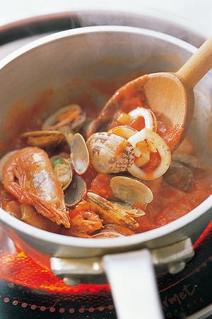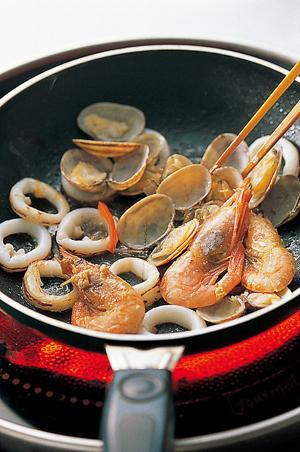 5. 한치는 껍질째 링 모양으로 썰고 바지락은 삶고 칵테일새우는 데친다. 이 재료를 올리브오일과 볶다가 백포도주와 소금을 넣어 맛을 낸다.