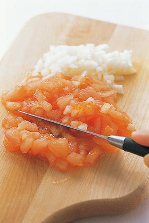 2. 껍질 벗긴 토마토를 손톱만한 크기로 굵직하게 다지듯 썬다. 양파도 손질해 비슷한 크기로 굵직하게 썬다.