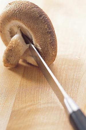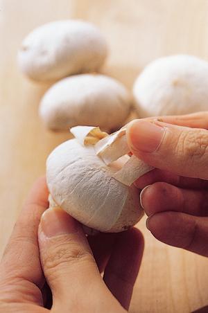 3. 양송이는 기둥 쪽에서 위쪽으로 껍질을 살살 벗긴 후 표고버섯과 비슷한 크기로 썬다.