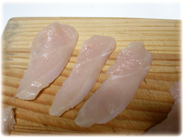 닭가슴살을 회감 짜르듯이 잘라줍니다.