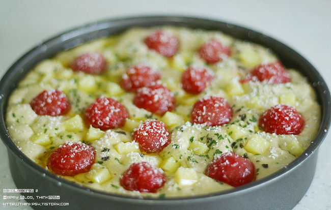 7. 작게 자른 에멘탈치즈를 반죽 위에 꾹꾹 눌러 얹은 뒤