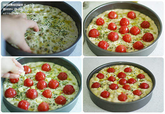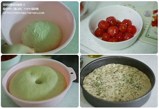 5. 반죽 위에 올리브유 1큰술을 골고루 뿌린 뒤, 손가락으로 바닥까지 꾹꾹 눌러 모양을 냅니다