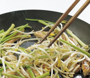 ④에 미나리와 숙주를 넣고 함께 살짝 볶는다.
