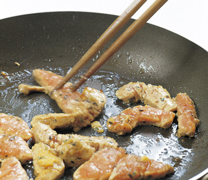 팬에 식용유를 두르고 밑간한 돼지고기를 볶는다.