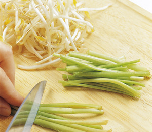 미나리는 잎을 떼어버리고 줄기 부분만 5cm 길이로 썬다. 숙주도 깨끗이 다듬는다.