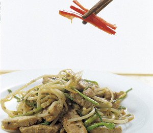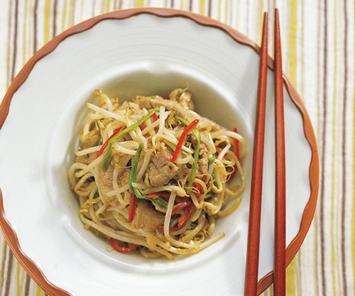 접시에 ⑤를 담은 뒤 붉은 고추를 채 썰어 얹어 매콤한 맛을 더한다. 채 썬 붉은 고추를 숙주, 미나리와 함께 볶아도 된다.