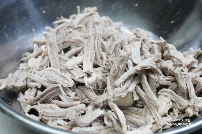 푹 익은 돼지고기만 건져 한 김 식혀 결대로 찢어주고