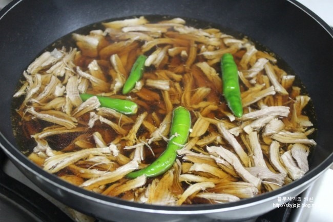 다시 냄비에 넣고 간장 반 컵, 설탕 반 술, 후추 1작은 술을 넣고