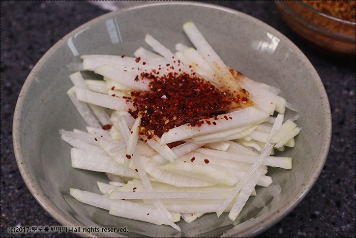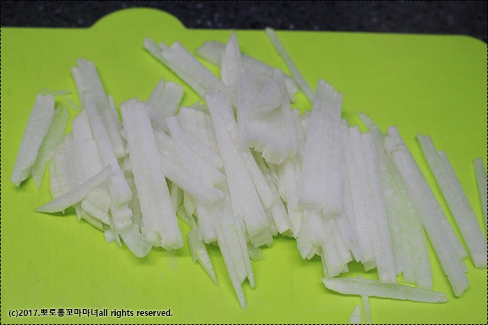 무는 대략 5cm정도의 두께를 채썰어서 준비했어요.