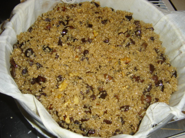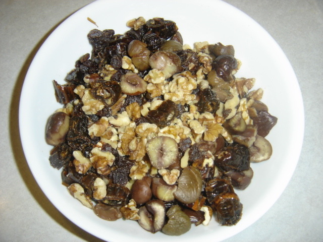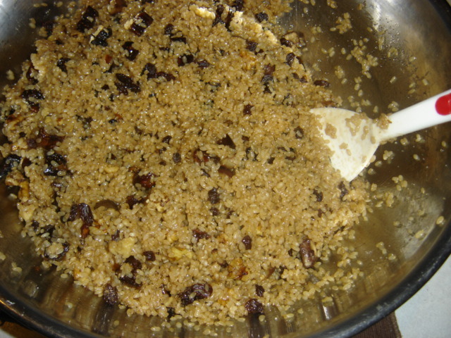 다 쪄진 현미 찹쌀을 큰 그릇에 옮겨 담고 건포도, 대추, 호두, 밤, 설탕, 계피 가루를 넣고 고루 섞어 주세요.