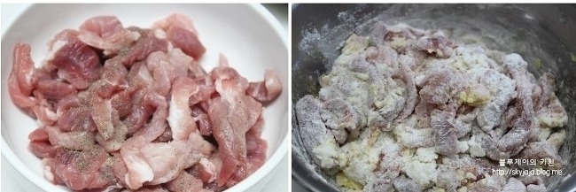 돼지고기 밑간 : 후추, 소금, 전분가루, 튀김가루, 달걀 한개