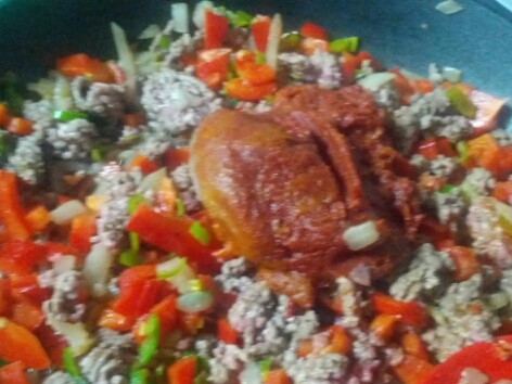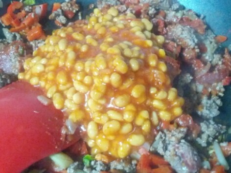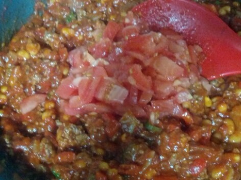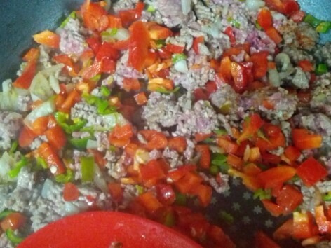 양파1개 빨강피망1개 청량고추3개 완숙토마토1개 통조림강낭콩1캔 다진쇠고기400그램 다진마늘2큰술