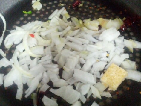 3.올리브유를 두른팬에 건고추를 넣고 볶다가 다진마늘 양파 순으로 넣어서 볶아주세요^^ 후추도 갈아 넣어주시구요^