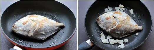 병어가 노릇하게 다 구워지면 슬라이스한 마늘을 넣고 조금 더 굽고
